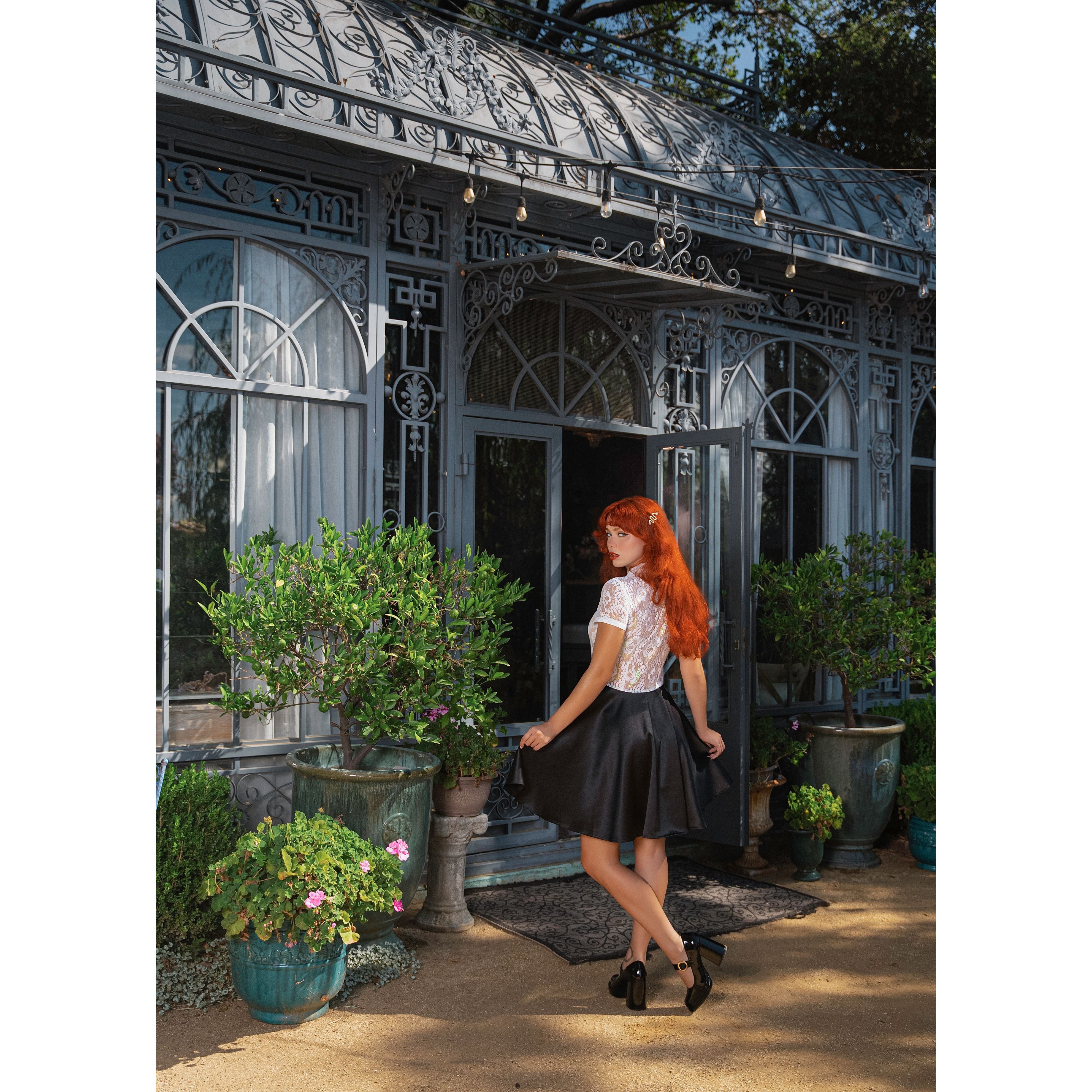 Introducing our exquisite Vespera cocktail dress, a perfect blend of elegance and sophistication. The upper bodice is crafted from delicate lace, adorned with subtle green shimmer that catches the light beautifully, creating a sparkling yet understated effect. The skirt, made from luxurious matte black satin, flows gracefully, adding a touch of refined simplicity. Each detail has been meticulously designed, featuring elegant silver and pearl buttons that enhance the overall charm of the dress. Ideal for cocktail parties, evening events, or special occasions, this dress embodies timeless style and grace.